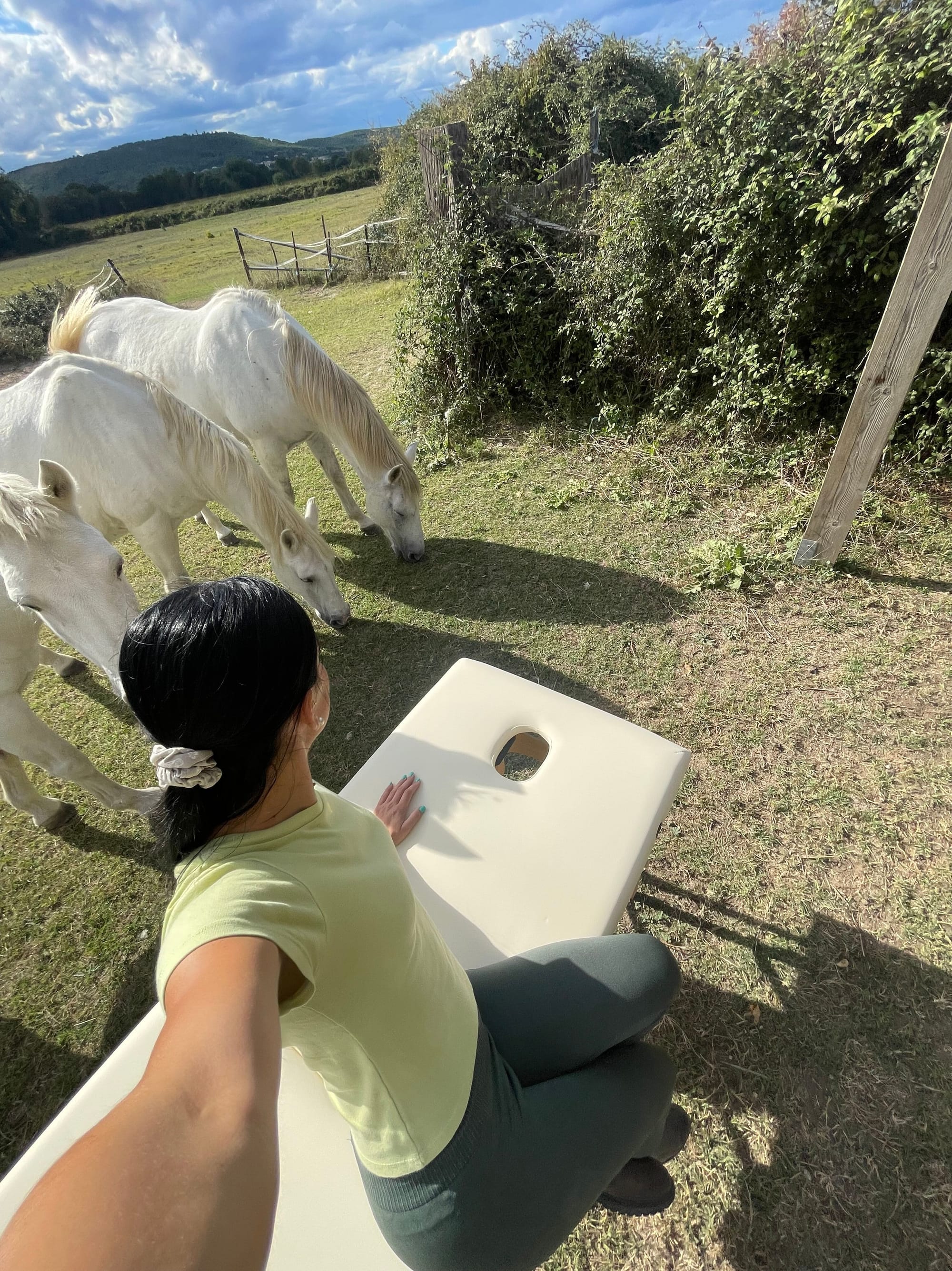 Séance dans le lieu de vie de 3 chevaux. Un cadre dépaysant et relaxant, entre vignes et garrigues. Les chevaux choisissent s'ils souhaitent participer au soin de près ou à distance. Environ 1h15 80€, réalisable selon intempéries